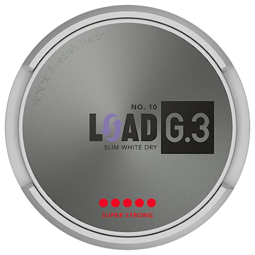 General G.3 LOAD Slim White Dry Super Strong is a high‑strength, white‑portion snus from the G.3 line by Swedish Match. The snus features a light and spicy tobacco base, complemented by licorice and eucalyptus, with subtle notes of anise, cocoa, and honey for complexity and depth. The portions are slim and have a dry outer surface, which reduces drip and ensures a longer, more controlled release of flavour and nicotine under the lip. A standard can contains 24 slim white dry‑surface portions; the net weight per can is 16.6 g. The nicotine content is high — approximately 26 mg per gram, giving roughly 18 mg per portion.