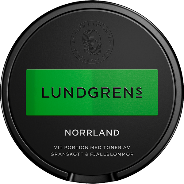 Lundgrens Norrland is a white‑portion snus celebrating the Swedish wilderness — combining a classic tobacco base with herbal‑forest notes inspired by northern nature. Expect a smooth tobacco character complemented by subtle tones of spruce shoots (juniper / pine tips) and mountain‑flowers (fjällblommor), giving a fresh and natural flavour profile. The pouches are white (dry exterior, moist interior), which delivers low drip and a discreet under‑lip feel while still ensuring a steady release of flavour and nicotine.