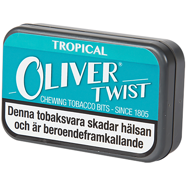 Oliver Twist Tropical is a smokeless chewing-tobacco product from House of Oliver Twist. The 7 g can holds about 30 small hand-rolled tobacco bits (“pastilles”), each delivering roughly 5 mg nicotine. The flavour profile is a distinctive blend of tobacco, anise (anis) and licorice (lakrits), with a subtle sweetness — giving a licorice-anise-tobacco taste instead of fruity or minty notes. Use by placing a portion between cheek and gum (or between jaw and cheek) and letting it rest for 30–60 minutes, during which nicotine and flavour release gradually.
