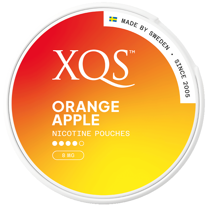 XQS Orange Apple Slim Strong are tobacco‑free nicotine pouches in a slim “white snus” format, offering a fruity blend of orange, citrus and apple for a refreshing flavour profile. The pouches are moist inside and dry outside, designed for comfortable placement under the lip. Each portion contains 8 mg nicotine, with a concentration of 16 mg per gram — labelled by XQS as “strong” (4/5). The product is made in Sweden by XQS (Insurgent Ventures II).